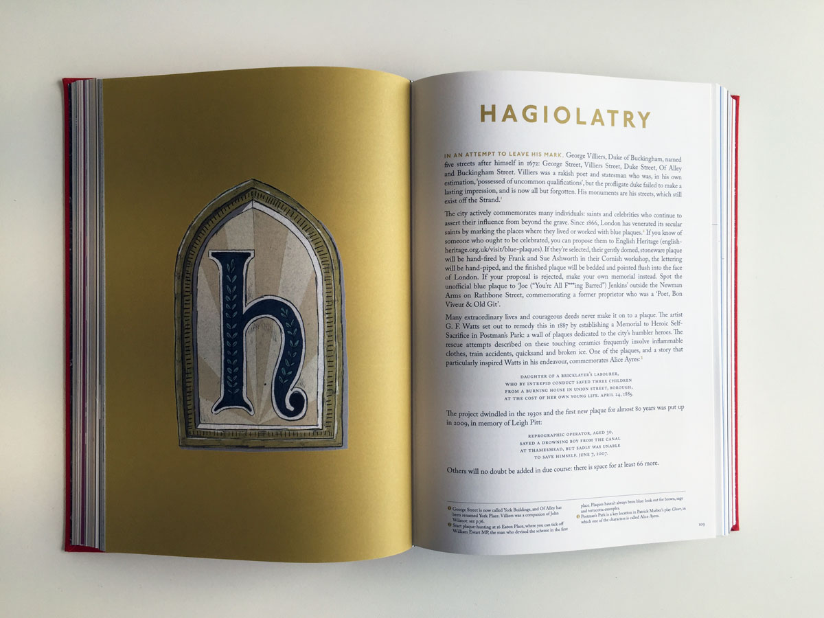 The book was designed by Here and is packaged in a minimal red cover with a lovely use of London’s most famous typeface, Johnston. Illustrated letters introduce each chapter and smaller spot illustrations appear throughout. Artist Stanley Donwood has created some black-and-white endpapers and the book boasts a long list of contributors, from author Philip Pullman to occult bookseller Geraldine Beskin, Astronomer Royal Lord Martin Rees and the Gentle Author.
